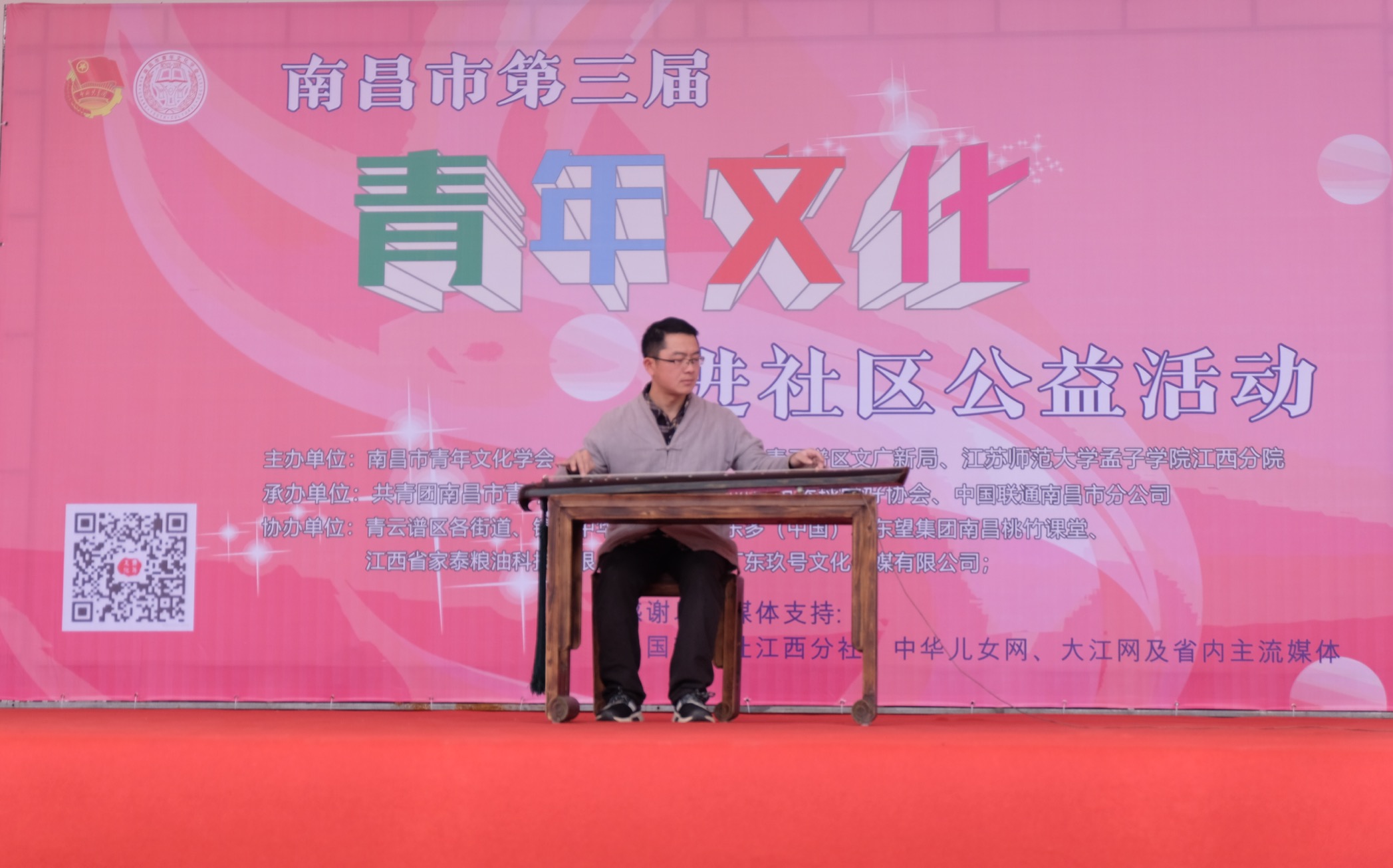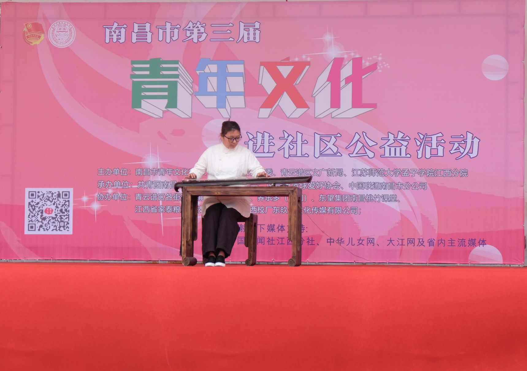 近日,由共青团青云谱区委、青云谱区文广新局、南昌市青年文化学会、江苏师范大学孟子学院江西分院联合主办的南昌市第三届青年文化进社区活动在洪都体育馆开幕。江西省古琴学会受邀参加开幕式,并为现场观众带来了精彩的古琴演奏,受到了热烈的欢迎。