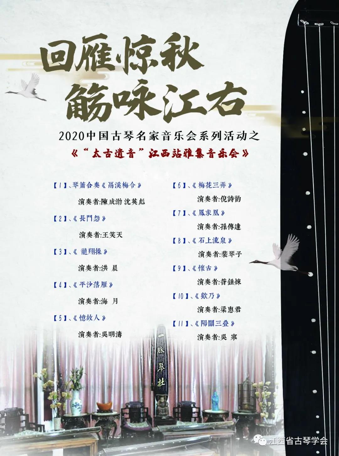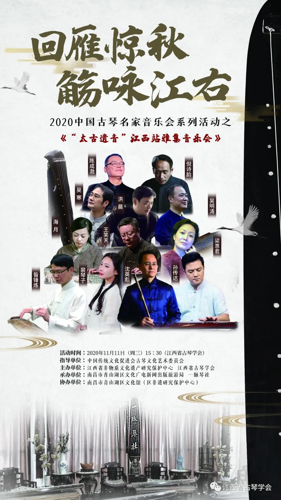 2020年11月11日,“回雁惊秋、觞咏江右”2020中国古琴名家音乐会系列活动之“太古遗音——江西站雅集音乐会”在江西省古琴学会圆满举办!
