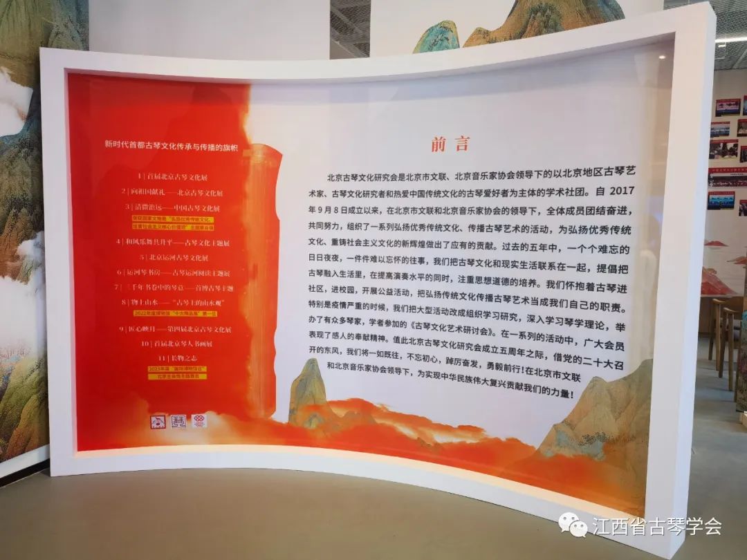时值“人类口头和非物质文化遗产代表作——中国古琴艺术”申遗成功20年, 为进一步普及古琴知识,弘扬中华优秀传统文化,第五届北京古琴文化展在北京市文联艺术工坊举办。该展览由北京市文联和北京市音乐家协会主办,北京古琴文化研究会承办,山水回响、盘古御琴、闻天阁等机构协办。江西省古琴学会一行观学了本次展览,并有幸亲自体验了古琴铭文、雕版琴谱拓印。