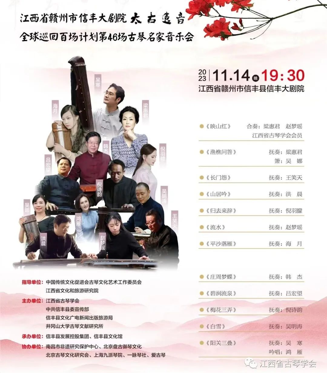 2023年是古琴艺术列入“人类口头和非物质文化遗产代表作名录”20周年,为进一步提高非遗保护意识,传承弘扬中华优秀传统文化。11月14日,“太古遗音 · 人信物丰”全球巡回百场计划之第四十六场古琴名家音乐会在江西信丰如期举行。