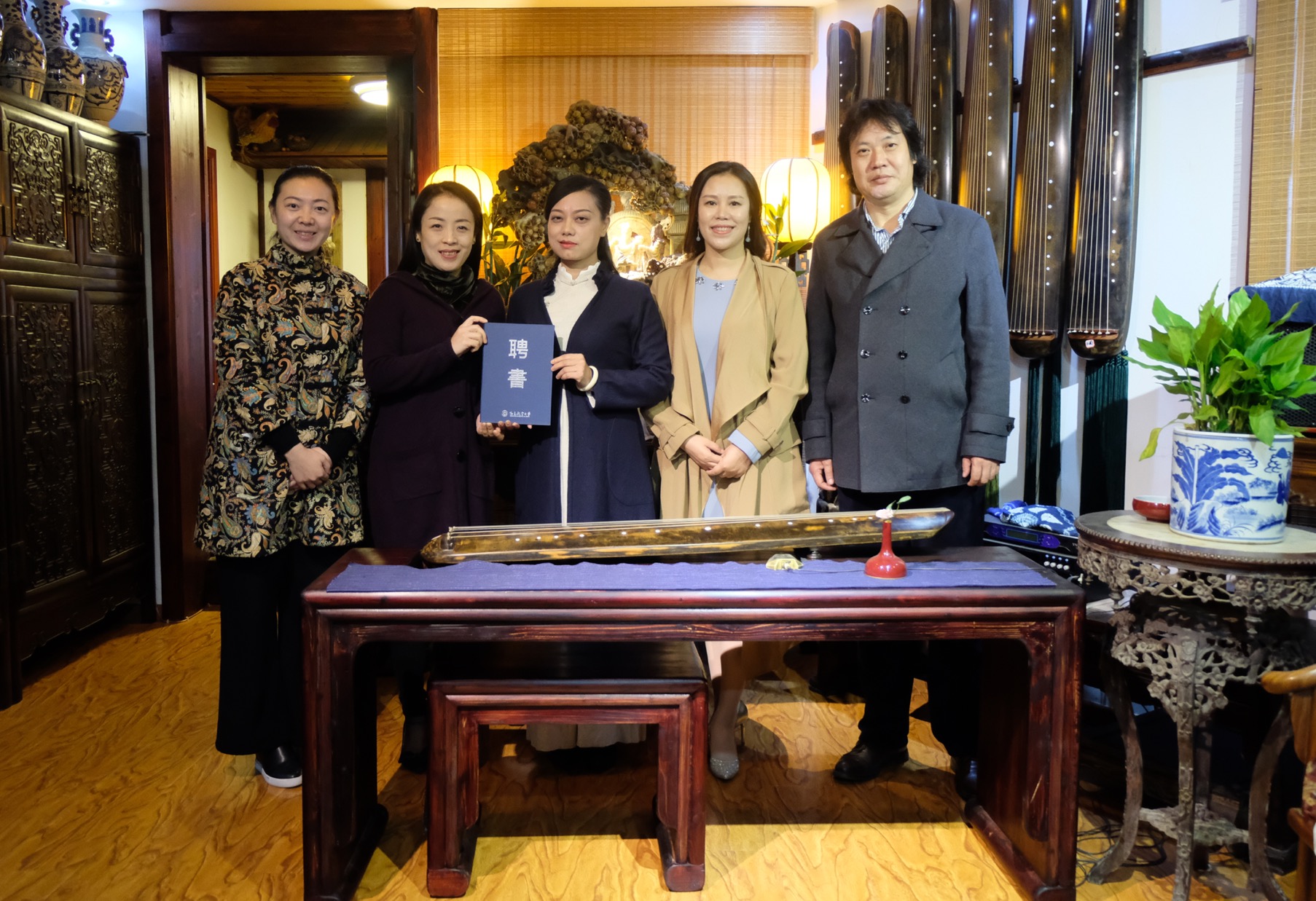 11月7日,南昌航空大学音乐学院党委书记周贤群、副院长(主持工作)黄敏、副院长张建国拜访江西省古琴学会,为江西省古琴学会会长、省级非物质文化遗产代表性项目江西古琴艺术传承人海月女士颁发南昌航空大学客座教授聘书,并宣布南昌航空大学“省级非物质文化遗产古琴艺术传承基地”挂牌成立!