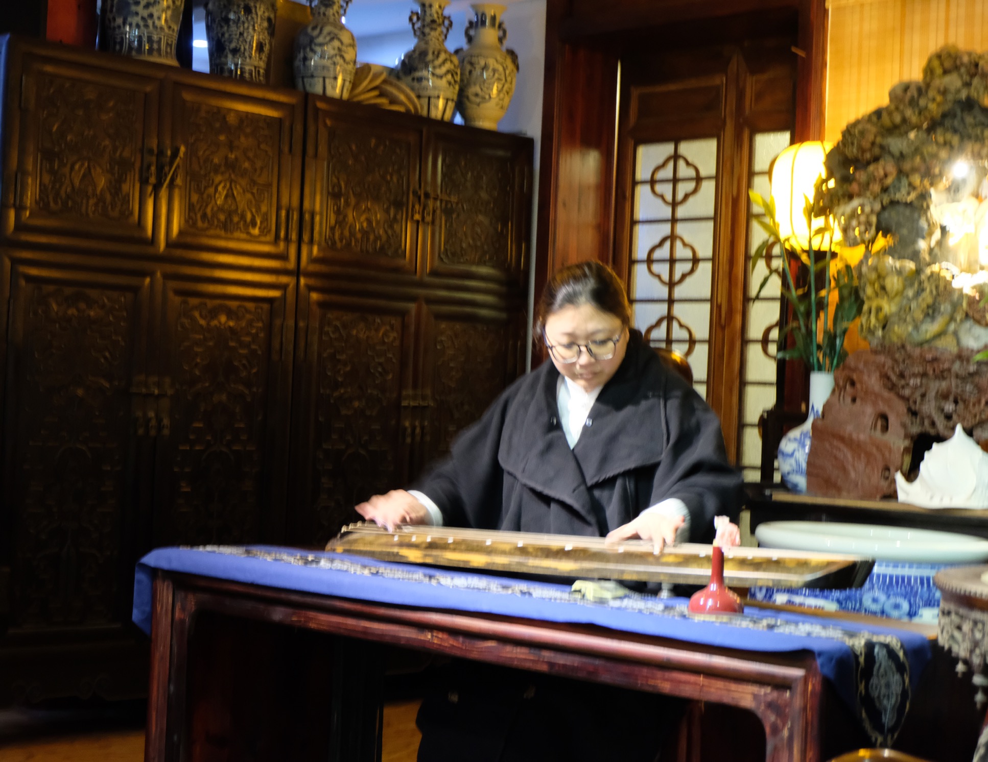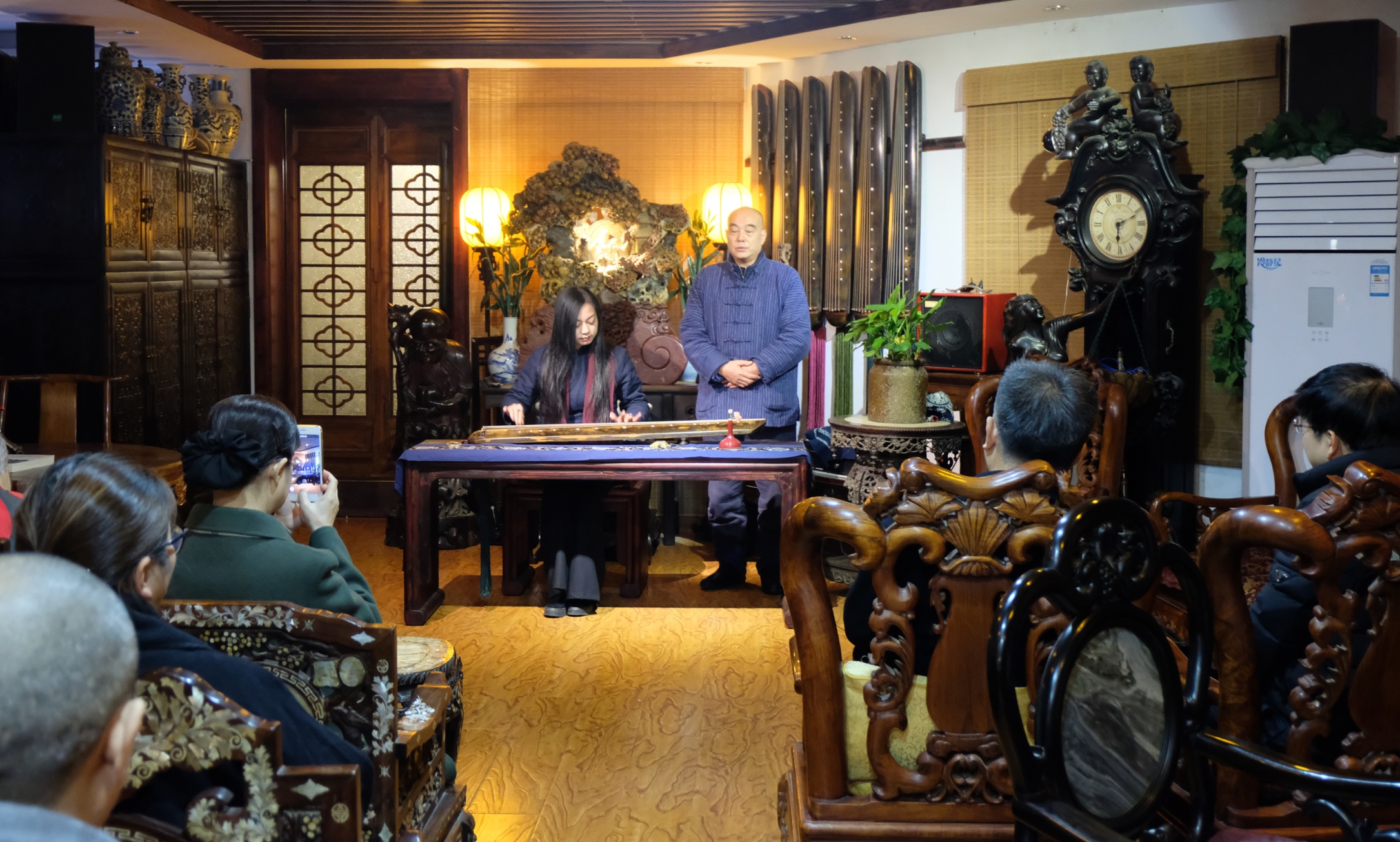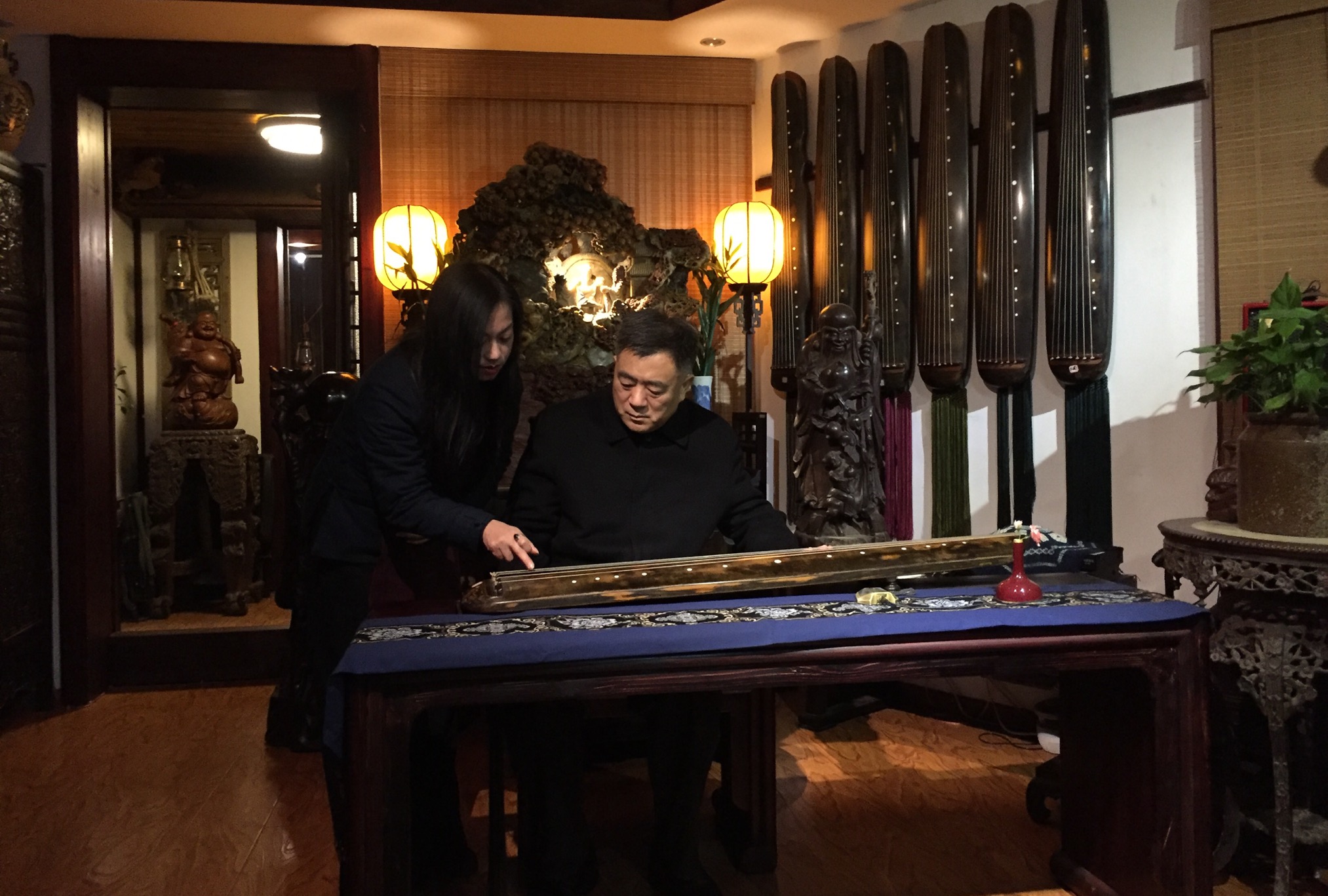 在交谈中,朱虹对江西省古琴学会传承的梅氏广陵琴学表现出极大的兴趣。海月会长携部分学会成员专门为朱虹一行举办了一场充分展示梅氏琴韵”刚柔相济、跌宕起伏、声韵并茂、绮丽细腻“艺术特色的古琴雅集。雅集结束,朱虹饶有兴致的坐到琴桌前,在海月会长的口传手授下,亲身感受了古琴艺术的魅力,并与大家合影留念,记录下这一美好时刻。