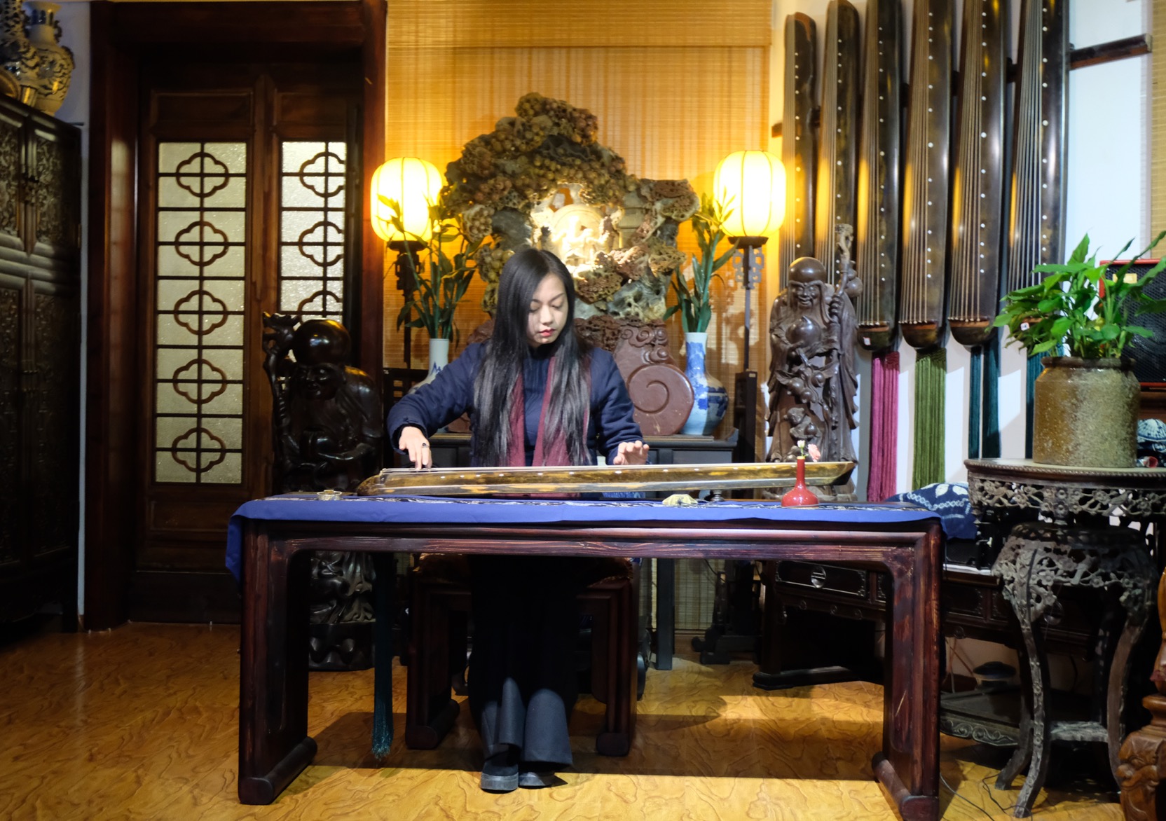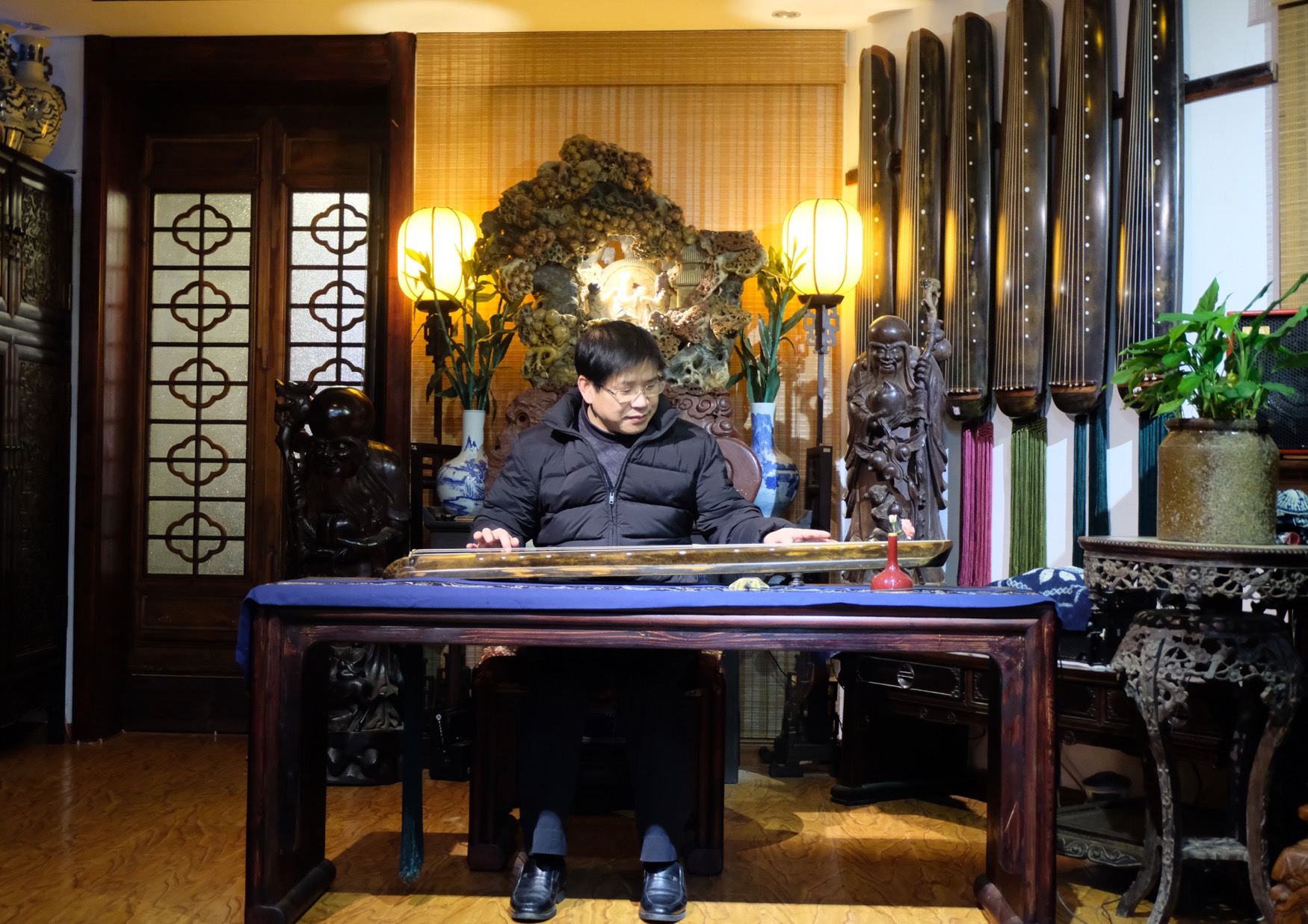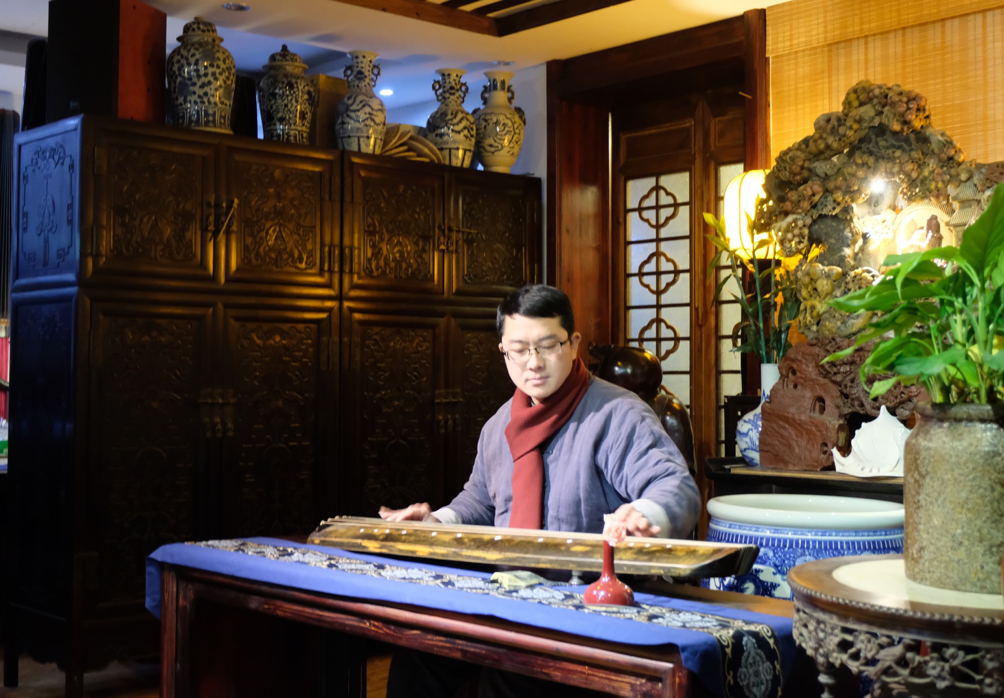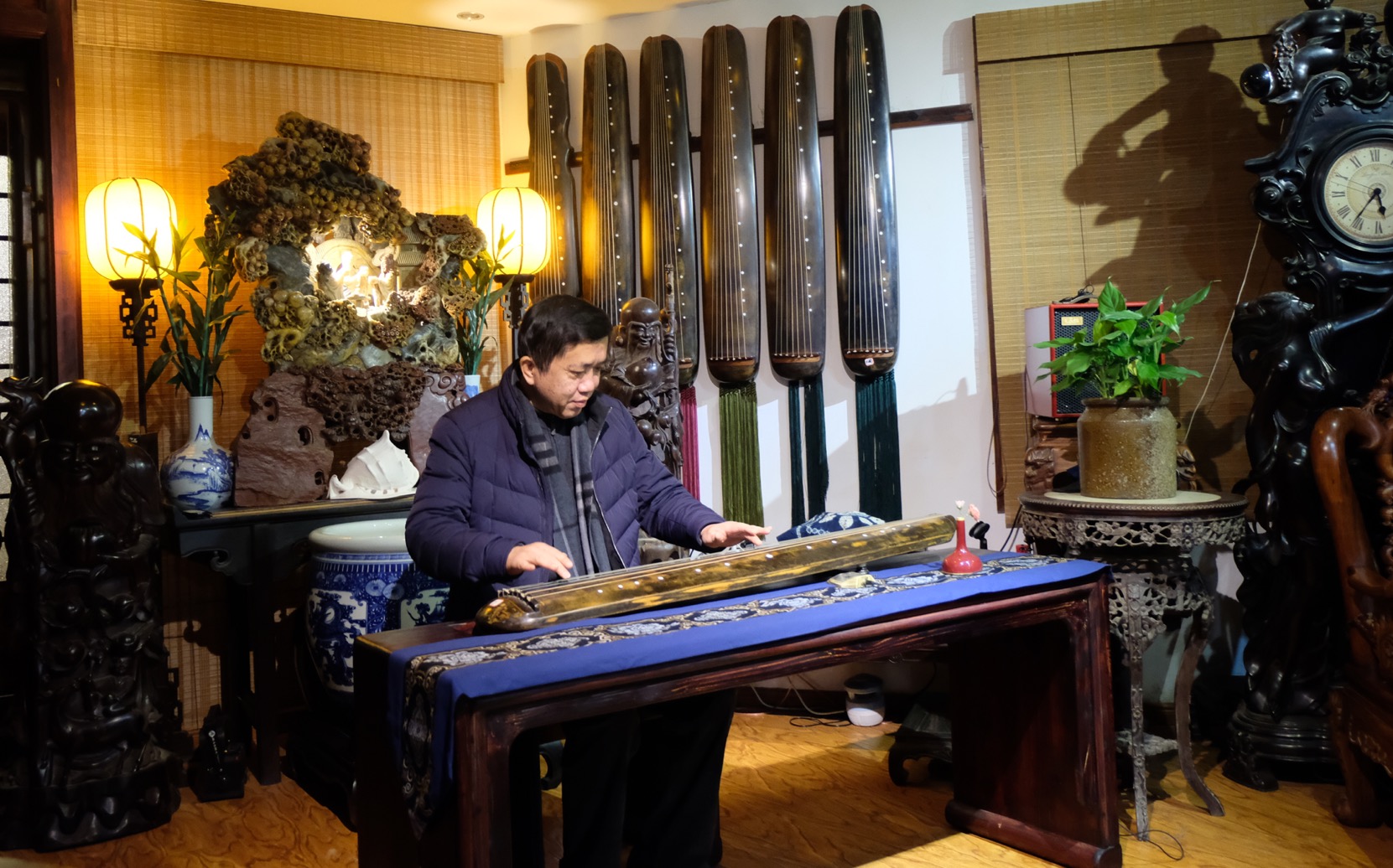 在交谈中,朱虹对江西省古琴学会传承的梅氏广陵琴学表现出极大的兴趣。海月会长携部分学会成员专门为朱虹一行举办了一场充分展示梅氏琴韵”刚柔相济、跌宕起伏、声韵并茂、绮丽细腻“艺术特色的古琴雅集。雅集结束,朱虹饶有兴致的坐到琴桌前,在海月会长的口传手授下,亲身感受了古琴艺术的魅力,并与大家合影留念,记录下这一美好时刻。